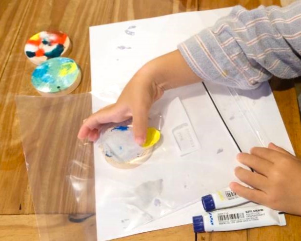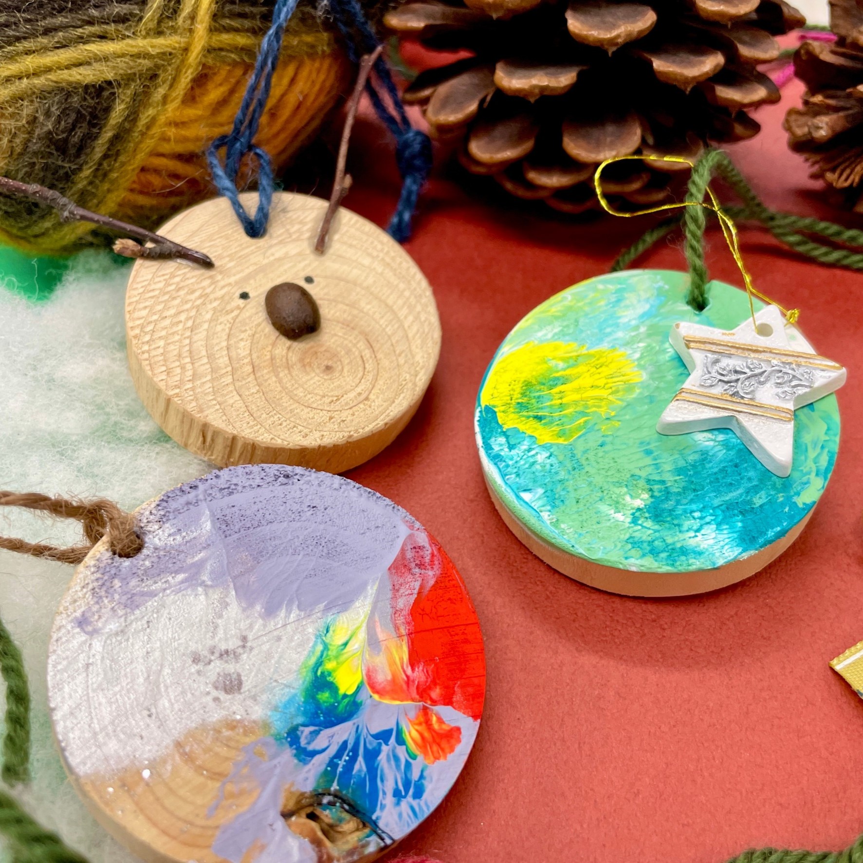 丸く切り抜いた木のパーツに絵の具で自由に飾り付けをしてオリジナルのオーナメントを作ってみよう!